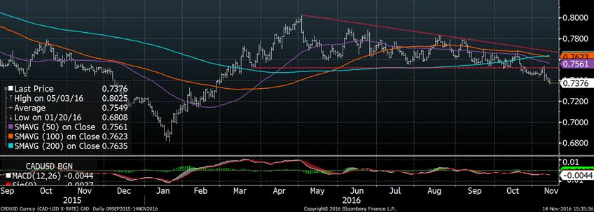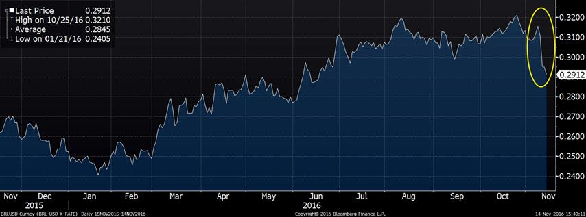 Contre toutes attentes, le dollar américain s’est fortement apprécié depuis la victoire de Trump. Le dollar américain est tellement fort depuis une semaine que l’indice du dollar américain est allé rejoindre les sommets de 2015, juste au-dessus de 100. Face à cette vague haussière, l’ensemble des paires de devises contre le $US ont baissé, notamment le dollar canadien, le peso mexicain et le real brésilien, 3 devises qui nous préoccupent dans le monde agricole. D’une part, le dollar canadien a touché aujourd’hui un nouveau bas depuis le printemps dernier, à 0.736 $US par 1$CA. Une tendance baissière semble bien s’installer avec une 4ème journée consécutive de baisse et les moyennes mobiles 50 – 100 – 200 jours sont toutes enlignées pour une tendance négative à long terme. Pour sa part, le peso mexicain demeure à sa plus faible valeur face au $US depuis sa création ce qui pourrait affecter les exportations américaines vers le Mexique… Il reste à voir si le dollar américain continuera à s’apprécier ces prochaines semaines pour surpasser les sommets de 2015. Techniquement, la zone 100 – 100.5 sur l’indice du dollar américain sera la résistance à percer pour une continuation du momentum actuel.