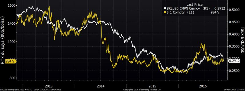 Relation prix du soya et taux BRL/USD (jaune = soya / blanc = BRL/USD)
