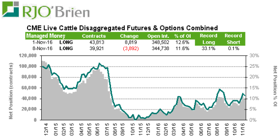Le rapport CFTC publié dans notre commentaire d’hier était par erreur celui du 1er novembre. Désolé pour les inconvénients, voici les chiffres du dernier rapport : Entre le 2 et 8 novembre, les spéculateurs ont vendu au net 3,892 CàT pour réduire leur position nette long à 39,921 CàT soit 11.6% de l’Open Interest.