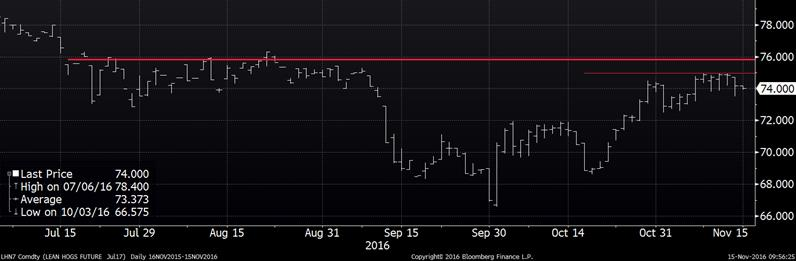 Pour le veau d’embouche, les CàT ont maintenu leur force grâce à un prix solide du cash et le prix faible du grain. Sur novembre, le CàT a terminé la journée d’hier avec 0.30¢/lb de hausse pour finir à 126.625¢/lb et sur janvier, la hausse était de 1.30¢/lb pour atteindre un prix à 122.325¢/lb à la fermeture. L’indice du veau d’embouche à la CME pour vendredi se situait à 125.38¢/lb (-0.26).