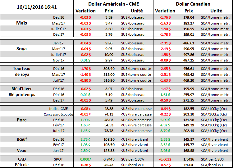 Par ailleurs, les estimés du rapport Cattle-on-Feed de vendredi sont publiés. On s’attend à une baisse des placements comparativement à octobre 2015, de l’ordre de -4.9% en moyenne. Comme toujours, la fourchette des estimés est très large, allant de -10.1% à -1.4% pour le rapport de vendredi. Un facteur qui pourrait expliquer des placements plus faibles en octobre est la chute des prix des contrats à terme de février et avril au début octobre, lesquels avaient brisé le seuil du 1.00 $US/lb ne permettant pas aux parcs d’engraissement de fermer un profit sur les achats de veaux en début de mois. Cependant, ces veaux sont toujours en pâturage et il se pourrait que le placement de novembre soit d’avantage important avec des bouvillons plus pesants.