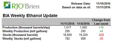 EIA a rapporté une production hebdomadaire de 1.017 million de barils d’éthanol par jour aux États-Unis ce qui est en hausse comparativement à la semaine dernière avec 1.002 million bpj et largement au-dessus du niveau de production de la même semaine en 2015 avec +4.3%. Présentement, nous aurions de besoin d’une production d’éthanol de seulement 992,000 barils par jour pour atteindre la prévision de l’USDA ce qui semble très réaliste compte tenu de la consommation élevée de gazoline. Un autre aspect important du rapport d’aujourd’hui est la diminution des inventaires d’éthanol par 0.62 million de barils à 18.61 millions. Les réserves sont donc rendues inférieures à celles de l’an dernier et c’est la première fois depuis le début juin que nous ne sommes pas en surplus versus 2015.