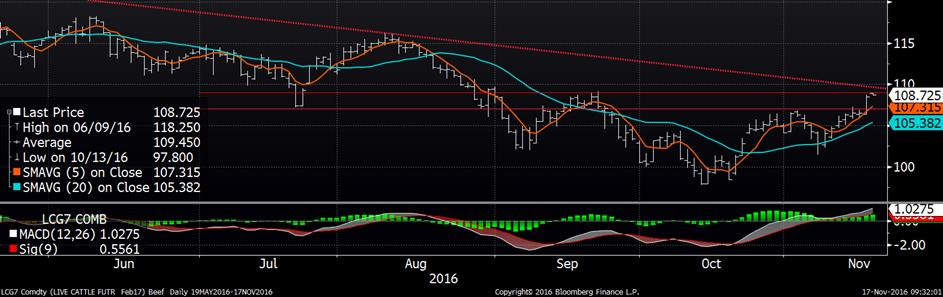 Le rapport Cattle on Feed sort demain. La chose à observer est surtout de voir si le niveau de placement en parc d’engraissement suivra les attentes. Advenant plus de placement qu’attendu, il faudra s’attendre à une baisse du prix des CàT sur juin et août. Les CàT du boeuf gras ont continué leur tendance haussière des derniers jours et atteignent des hauts sur près de deux mois ce qui semble la prochaine résistance à briser. Sur décembre, la fermeture d’hier a été enregistrée à 108.20¢/lb, une hausse notable de 2.725¢/lb sur la journée et sur février, une hausse de 1.975¢/lb du CàT pour terminer à 108.50¢/lb et dépassant la moyenne mobile 100 jours. La prochaine résistance à briser est le haut de septembre à 109.125¢/lb. Le CàT à terme d’avril se situe à 108.625¢/lb. Ce qui a alimenté les marché hier, c’est surtout l’encan électronique au cours de la journée avec de prix cash à 105.50 en début de séance pour finir à 108.25 ¢us/lb.