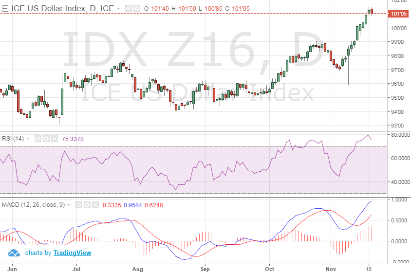Dollar/Pétrole : Malgré les élections américaines le dollar américain demeure TRES fort avec l’indice USD Index passant au-dessus des 100 points la semaine dernière. Techniquement le Dollar Index est sur une lancée ; le MACD montre un gros signal d’achat le 11 novembre et depuis les cours suivent une tendance haussière qui explique le RSI élevé. Le marché anticipe maintenant que la FED haussera les taux en décembre d’un quart de point. En fait, les traders utilisent une quasi-certitude à ce niveau car les probabilités implicites d’une hausse sont à 95.4%. La hausse du huard aujourd’hui est plutôt attribuable au pétrole qui bondi de plus de 4% en route vers un retour au-dessus de 50$ le baril. La hausse des prix est en lien avec les discussions sur la prochaine rencontre de l’OPEP le 30 novembre prochain et l’interminable débat sur la possibilité de réduire/couper la production afin de contrôler l’offre. Techniquement il y a beaucoup de bruit autour de 46.50$ un niveau pivot entre support et résistance depuis deux semaines. Le RSI donne suffisamment de jus pour revenir sur les résistances à 52$ - à suivre…