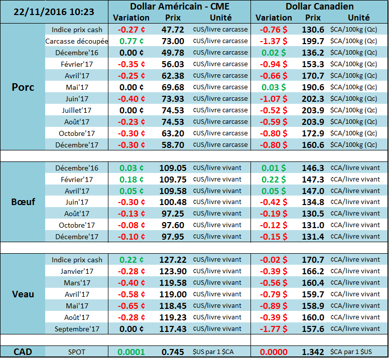 Sur le marché du bœuf, alors que des hauts de 3 mois ont été atteints au courant de la journée, les niveaux de fermeture des CàT affichaient seulement de légères hausses. Sur décembre, la fermeture se situait à 109.025¢/lb, février à 109.575¢/lb et avril à 109.525¢/lb. Ce qui est en ligne avec l’encan électronique de mercredi dernier.
