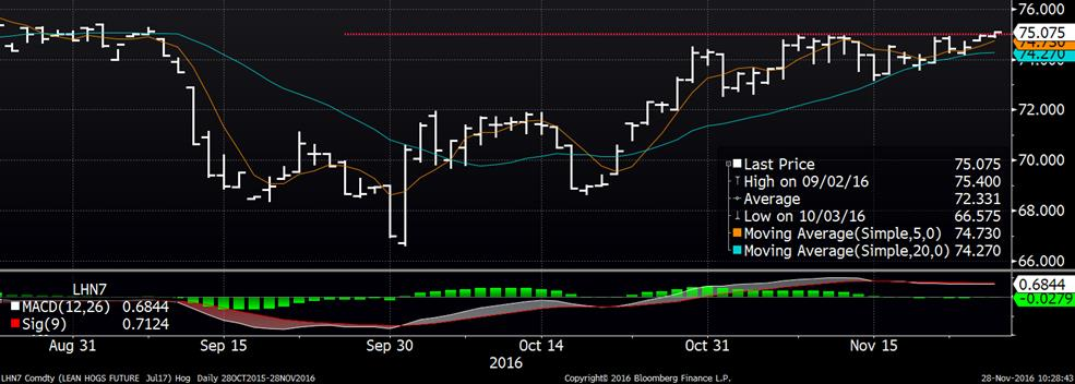 En ce qui concerne le marché du porc, des hauts de plus de deux mois ont été observés sur la journée de vendredi. Les prix de clôture vendredi dernier des CàT se situaient à 51.05¢/lb sur décembre, 56.75¢/lb sur février et 62.90 sur avril. De plus, la hausse se poursuit aujourd’hui, soit de +0.5%. On surveille de près les mois d’été qui soit nez-à-nez avec leurs sommets des derniers mois.