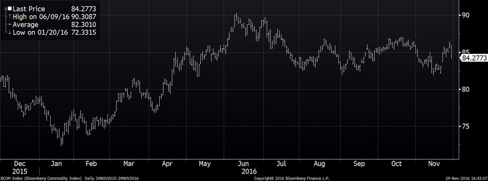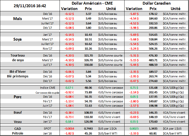Dans le monde des matières premières, la journée commençait mal avec une baisse des prix des métaux à Londres et d’une baisse du prix du pétrole puisque l’OPEP ne semble pas s’entendre sur un accord. La baisse du marché des matières premières s’est répandue dans le complexe agricole en matinée ce qui a occasionné une diminution des prix presque partout. L’indice Bloomberg qui regroupe 22 commodités a terminé la journée avec une performance de -2% alors qu’on s’apprêtait à rejoindre les sommets du mois d’octobre.