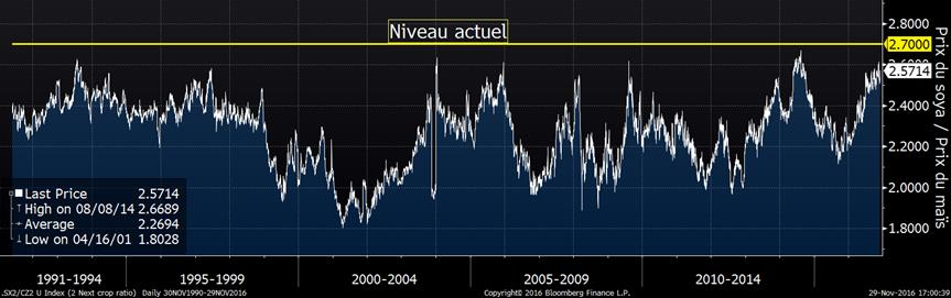 Ratio entre le prix du soya et du maïs, une récolte en avance (actuellement la récolte