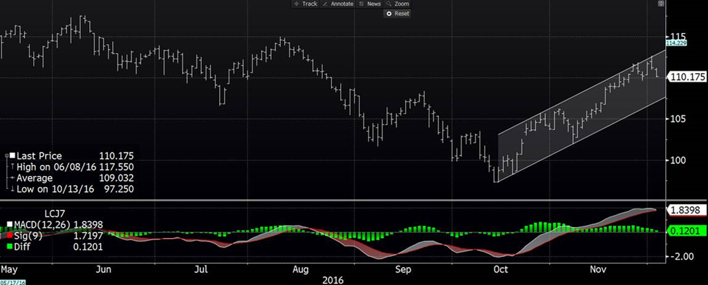 En ce qui concerne le marché du porc, des baisses ont été enregistrées sur la majorité des CàT. Décembre a terminé la journée à 50.225¢/lb, en baisse de 0.80¢/lb et février a terminé à 54.075¢/lb en baisse de 1.15¢/lb. Le CàT de février a tout juste passé sous la moyenne des 18 derniers jours et son niveau le plus bas des deux dernières semaines. Le CàT d’avril a clôturé à 60.45¢/lb en trouvant support sur la moyenne 100 jours qui se trouve à 59.884¢/lb.