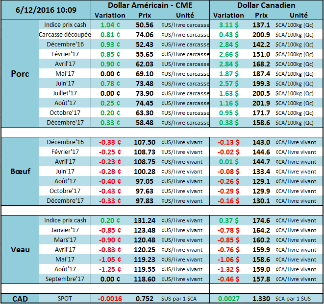 Sur le marché du bœuf, les prix n’affichaient pas vraiment de tendance sur la journée d’hier alors que certains des CàT étaient à la hausse et d’autres à la baisse. Le contrat de décembre a terminé la journée à 107.825¢/lb, février à 108.975¢/lb et avril à 108.975¢/lb. On peut remarquer par contre que la marge des abattoirs, qui était assez élevée récemment, a littéralement fondue alors que HedgersEdge donne une marge à 7.05$ la tête (ce qui pourrait atténuer la demande de bœuf gras, même si les prix à la découpe sont à la hausse). À la découpe, le Choice affichait 191.39¢/lb en fin de journée et le Select 173.23¢/lb.