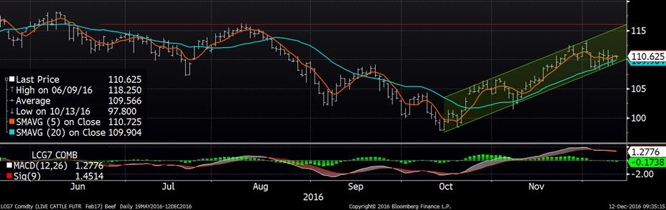 Les prix sont stables à légèrement haussiers ce matin, on teste toujours le bas du canal haussier pour les CàT de bœuf. Par contre, l’indicateur MACD n’est plus positif et on note qu’à court terme, les prix sont sous pression.