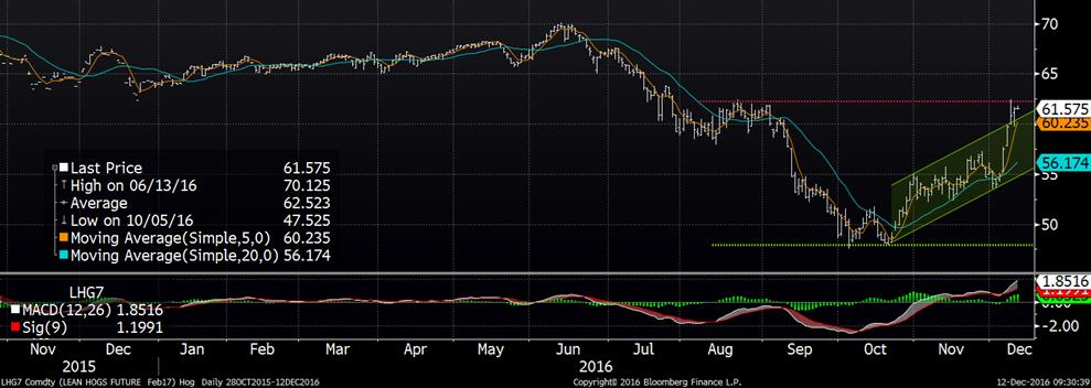 Sur le marché du porc, 5e journée consécutive à la hausse sur les contrats à terme ce vendredi. Sur décembre, une hausse de 1.05¢/lb pour un prix de clôture à 56.725¢/lb et sur février, hausse de 0.73¢/lb pour un prix de clôture à 61.55¢/lb. Sur la semaine, ces deux contrats ont connu une hausse de 6 et7¢/lb, et le contrat de décembre a connu un nouveau haut depuis les 4 derniers mois. Légère baisse par contre ce vendredi sur le CàT d’avril alors que le prix de fermeture affichait 65.95¢/lb (-0.40). Le prix de la carcasse découpée était relativement stable à 75.81¢/lb (-0.07) vendredi, mais la hausse était de 2.56¢/lb sur la semaine. La marge des abattoirs était estimée à 39.45$ la tête selon HedgersEdge. Au niveau du prix cash, la tendance se maintient à un gain de plus d’une cent/lb par jour, avec un indice CME publié à 54.33 (+1.16) en date du 8 décembre. Il nous reste donc 4 publications du prix cash pour déterminer le prix de règlement final du CàT de décembre qui est 2.5 ¢/lb au-dessus du cash.