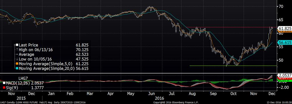 Sur le marché du porc, autre journée à la hausse lundi, une 6e consécutive. Le CàT de décembre était à la hausse de 0.65¢/lb, février de 0.63¢/lb et avril de 0.73¢/lb pour atteindre des niveaux à 57.375¢/lb, 62.175¢/lb et 66.675¢/lb respectivement. C’est davantage le prix cash du porc qui emmène le marché à la hausse alors que sur la dernière semaine, une hausse moyenne de plus de 1.00¢/lb par jour est enregistrée. L’indice CME publié pour les abattages du 9 décembre est de 55.52¢/lb (+1.20). Le prix de la carcasse découpée a terminé la journée de lundi à 76.38¢/lb (+0.57) et HedgersEdge donnait la marge des abattoirs à 41.05$ la tête.