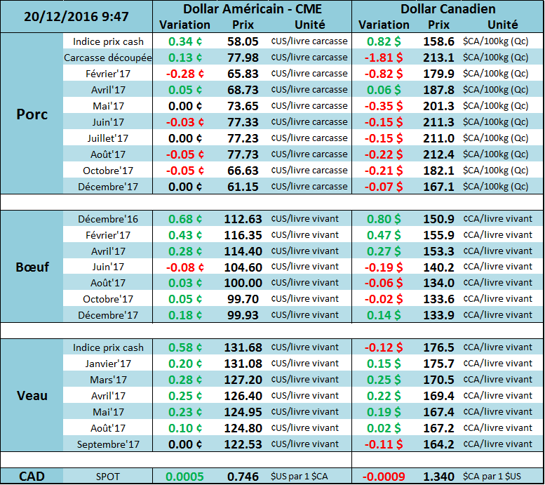 Concernant le marché du veau d’embouche, les CàT ont été à la hausse également hier alors que janvier a terminé à 130.875¢/lb (+0.98) et mars à 126.925¢/lb (+0.63). L’indice CME en date de vendredi était de 131.68¢/lb. Les CàT atteignent aussi un sommet depuis la fin août. Il reste à voir si les faibles placements de septembre et d’octobre seront compensés par des placements volumineux en novembre ou bien si le déficit continuera ce qui pourrait supporter le marché du veau pendant encore quelques semaines. Présentement, la structure à terme des prix est très prononcée avec le prix de janvier bien au-dessus des CàT suivants (backwardation) ce qui nous indique une forte demande.