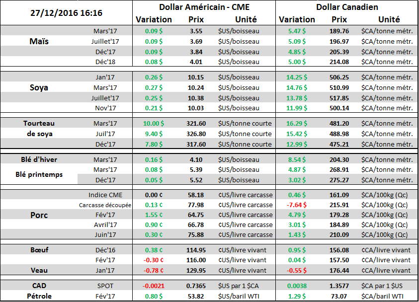 Solide début de semaine sur le CBOT avec le grain en hausse de 2 à 3% sur un volume intéressant. On voit souvent peu de transactions entre Noël et jour de l’an mais nous avons eu passablement d’activité aujourd’hui : 117K contrats sur le blé d’inde, 127K pour la fève et 65K pour le blé a été plus fort que la semaine passée. La raison de la hausse n’est pas vraiment bien définie, je pense que c’est un ensemble de facteur qui, une fois combiné un à l’autre donnait des conditions favorables pour les achats. Prenez un de ces facteurs et vous aurez la réponse :