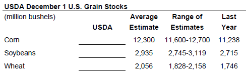 · Le marché s’attend à ce que les stocks au 1er décembre soit de 12.3 milliard de corn, 2.935 milliard de soja et 2.056 milliard de blé. En retirant les valeurs connues d’éthanol, crush et export on se rend compte que le marché anticipe une très forte utilisation pour Q1 pour les 3 types de grain.