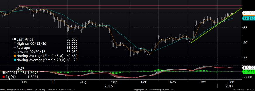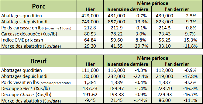 Les CàT de bœuf gras étaient à la hausse hier alors qu’on suit toujours le canal haussier qui a débuté au début du mois de novembre. Sur février, la fermeture hier était de 119.58¢/lb (+1.05), sur avril de 119.00¢/lb (+1.07) et sur juin de 108.53¢/lb (+0.50). Pas surprenant qu’on observe des hauts de 8 à 10 mois sur la plupart des CàT. Les transactions cash de vendredi dernier étaient enregistrées entre 118¢/lb et 120¢/lb en hausse de 1.00¢/lb versus la semaine précédente. Il sera donc intéressant de voir la performance des transactions aujourd’hui sur l’encan électronique. Voici le lien afin de pouvoir suivre le déroulement de celui-ci sur www.fedcattleexchange.com. Avec le prix qui continue à monter et le prix des découpes qui reste assez stable à 191.62¢/lb pour le Choice et 187.23¢/lb pour le Select, la marge des abattoirs est assez mince ces jours-ci. Elle est évaluée à -9.45$ la tête versus 21.45$ la semaine dernière. Baisse au niveau des abattages alors qu’on se trouve à 180,000 têtes jusqu’à maintenant, mais ceci s’explique par le congé férié de lundi (Martin Luther King day).
