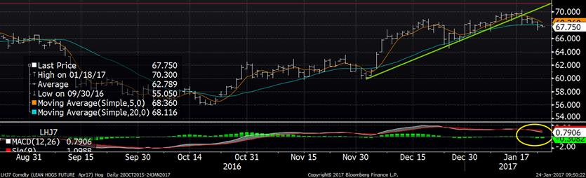 On peut remarquer que la courbe ne tend pas à la hausse vers février et avril 2018 comme on pourrait s’attendre normalement, ce qui laisse donc croire que les attentes de production plus élevée pour la prochaine année se font ressentir dans le marché. Déjà avec le rapport cattle-on-feed du mois dernier, la production était attendue à la hausse sur les mois d’avril à juin. Reste donc à voir si le rapport annuel sur le cheptel américain (publié le 31 janv.) confirmera cette même tendance mais pour l’année complète.