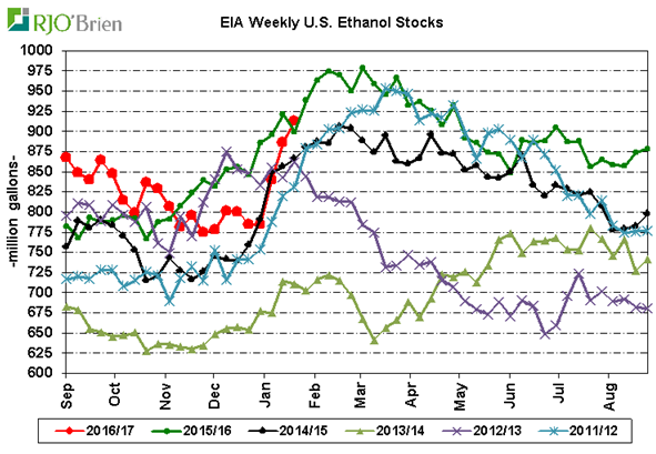 Cependant, les inventaires d’éthanol ont bondit de 613,000 barils ce qui indique que la production actuelle est un peu trop élevée face à la demande de gazoline qui a reculé. Ça fait tout de même parti de la saisonnalité des inventaires d’augmenter en janvier/février, mais le déficit comparativement à 2015/16 est maintenant effacé.