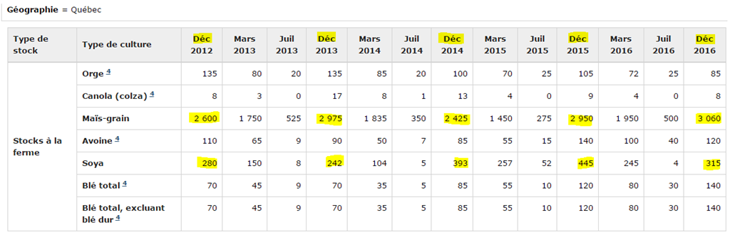 · Inventaires de soya au Québec au 31 déc : 315,000 tonnes (-29% vs 2015)
