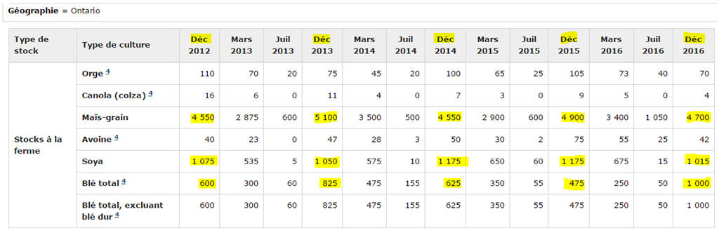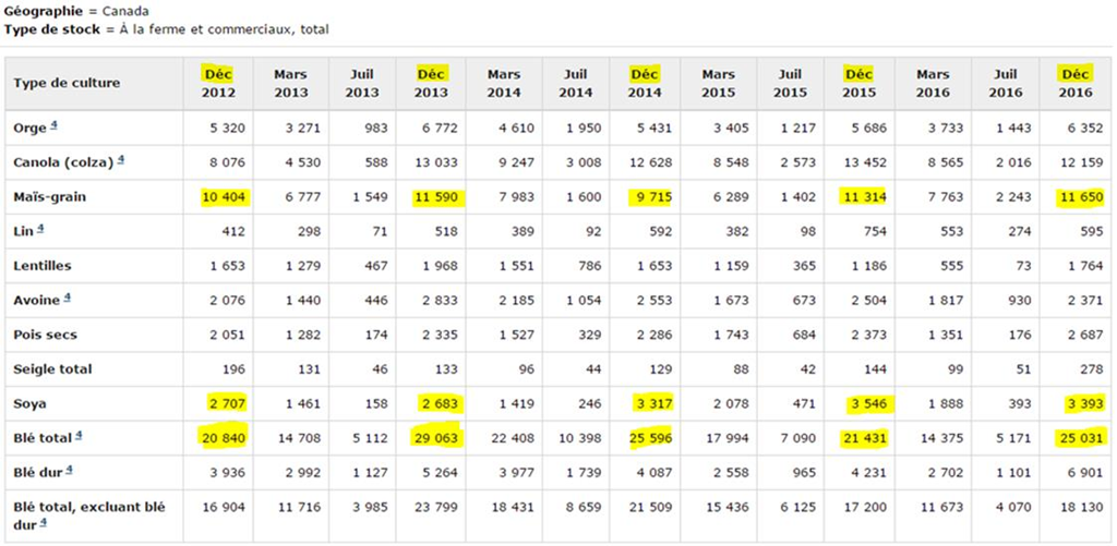 Rapport sur les stocks des principales grandes cultures au Canada en date du 31 décembre 2016. Voici les résultats qui retiennent l’attention :