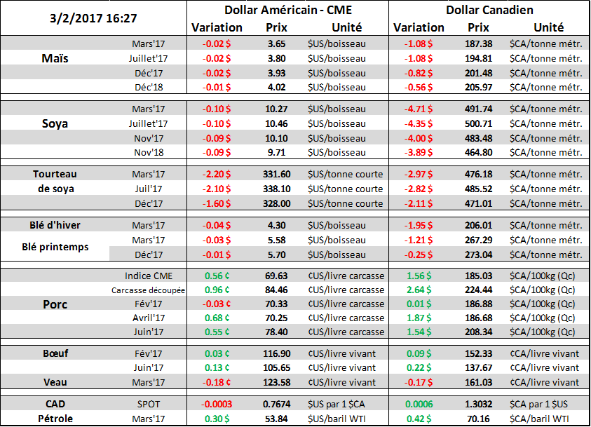 · Inventaires de maïs au Canada au 31 déc : 11.65 M tonnes (+3.0% vs 2015)