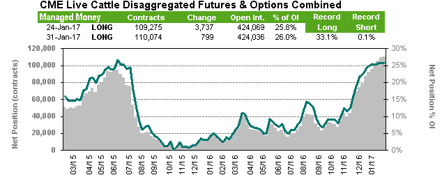 Au niveau des spéculateurs, entre le 24 et le 31 janvier, un net de 799 CàT de bœuf ont été achetés pour porter leur position à 110,074 CàT, représentant 26% des CàT existants (open interest). On note un ralentissement de l’augmentation des positions long et si la tendance se renverse, la vitesse à laquelle la position nette long baissera pourrait être assez rapide et ceci entraînerait une accélération à la baisse.