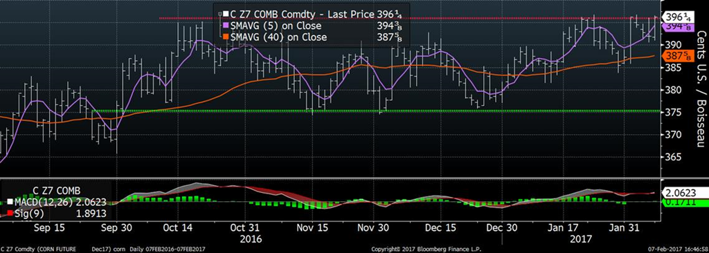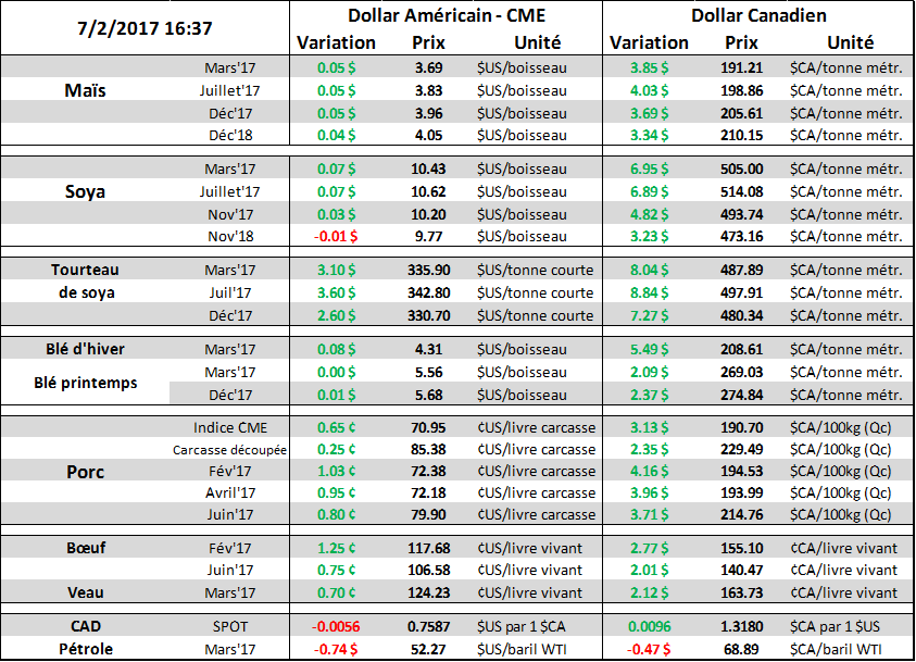 Au niveau des grains, les prix restent forts malgré l’énorme récolte qui arrivera sous peu d’Amérique du Sud. Le prix du maïs est de retour à sa résistance à 3.96 $US/boisseau sur la nouvelle récolte. Depuis 4 mois, le prix du maïs est emprisonné entre la fourchette de 3.75 – 3.95 et on pourrait s’attendre à ce que les spéculateurs achètent des contrats si jamais on perce la résistance. Ils ne détiennent pratiquement pas de position dans le maïs présentement, ce qui leur laisse la flexibilité dans les prochaines semaines, dépendamment des nouvelles tendances. Au Brésil, la moisson du maïs avance tranquillement, complétée à 9% ce qui est un peu plus que l’an dernier et en ligne avec la moyenne 3 ans. De plus, les semis pour la 2ème récolte de maïs, Safrinha, sont terminés à 20% dont 37% à Mato Grosso ce qui est cohérent avec la moisson du soya. En effet, la plus grosse région productrice de fève a récolté près du tiers du soya ce qui est pratiquement 3 fois plus que la moyenne du pays. Il ne faut pas oublier que la deuxième récolte de maïs brésilienne est faite sur les superficies qui sont présentement en soya. Avec autant de fèves récoltées à Mato Grosso, il y a déjà 4.7 millions de tonnes prêtes à être exportées ce qui représente le double du volume des dernières années. Il faut donc s’attendre à ce que les ventes à l’exportation des États-Unis diminuent prochainement puisque les acheteurs se tourneront tranquillement vers l’Amérique du Sud, bien qu’il n’y a pas une grosse différence de prix pour la fève. Le soya est tout juste sous les 400 $US/TM aux É.-U et au Brésil. C’est au niveau du tourteau que la différence de prix est plus marquée, à 370 $US/TM aux É.-U. comparativement à 343 $US/TM au Brésil.