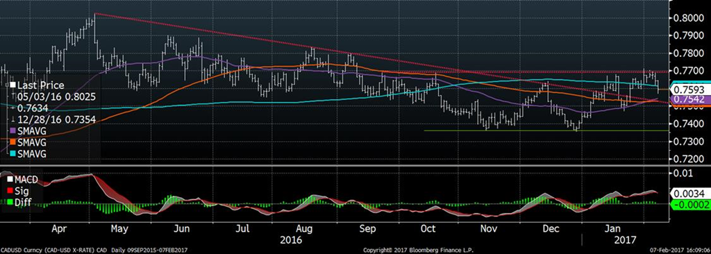 Depuis l’ouverture d’hier, le dollar canadien a reculé de plus d’un pourcent. Vendredi, on a testé la résistance de 0.77$US pour une 3ème fois durant la semaine, incapable de terminer une séance au-dessus de ce niveau. C’était le dollar américain qui avait faibli suite aux dires du nouveau président américain quant à ses politiques d’immigration. Les investisseurs craignent un impact négatif sur les relations commerciales de la plus grosse économie mondiale et ont revu les perspectives de rendement à la baisse. Depuis, le dollar américain a repris de la force, en partie grâce aux bons chiffres sur l’emploi publiés vendredi dernier. Il y a eu 227,000 nouveaux emplois en janvier et la population active augmente ce qui démontre que le plan de Trump donne de l’espoir aux sans-emplois. De plus, le prix du pétrole a perdu 2.00 $US/baril cette semaine, ce qui accentue la pression baissière sur notre huard. La tendance actuelle n’est pas claire et il y a toujours beaucoup d’incertitude face au Président Trump. Notez qu’il y aura les chiffres d’emploi au Canada ce vendredi.