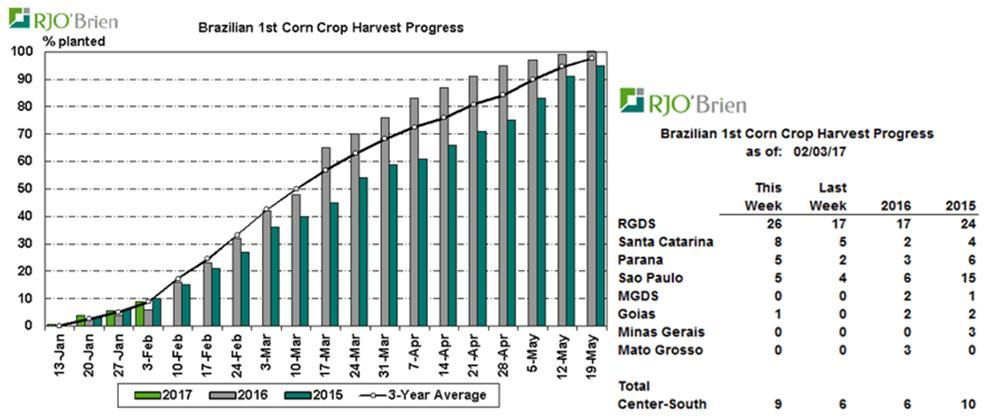 · 1ère récolte brésilienne de maïs est en avance sur l’an dernier, mais en ligne avec la moyenne
