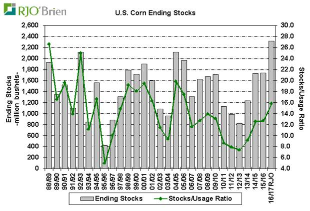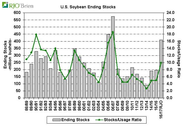 Pour le maïs : « Mince » augmentation de la consommation pour le secteur éthanol. Compte tenu de la force de la production dans les derniers mois, l’USDA aurait pu augmenter cette case d’utilisation encore plus mais USDA a préféré rester très conservatrice. Les inventaires de fin sont toujours prévus pour être très élevé à 2.320 milliard et les ratios d’utilisation à 16%. Les flux monétaires (investisseurs, spéculateurs) continuent de dominer l'activité commerciale pour le moment, comme en témoigne l'augmentation de 61,000 contrats (open interest) dans les six dernières sessions et l'augmentation de 166,000 depuis le début de l’année 2017. Avec des stocks de maïs américains de +2,320 milliards (sommet de 30 ans) ainsi que des ratios d’utilisation à 16% (sommet 10 ans), il y a beaucoup de questionnements sur la structure actuelle ou plutôt la capacité/nécessité de faire monter les prix à court terme.