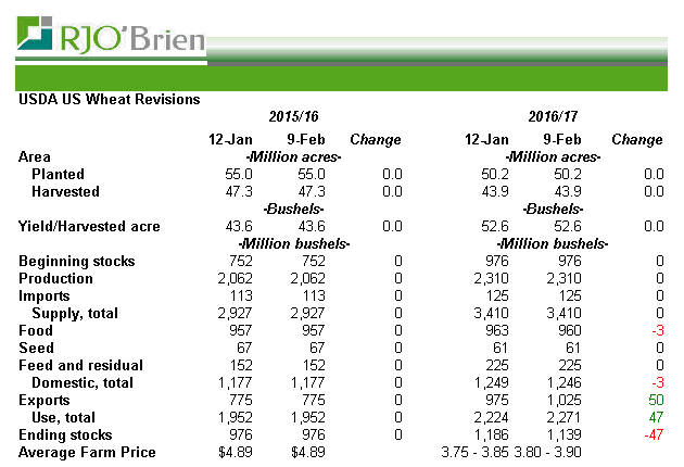 Pour le blé : Le marché du blé a vu un peu de soutien des prix aujourd'hui après l'augmentation plus importante que prévue de l'USDA de son estimation des exportations de blé des États-Unis. Alors que les meilleures projections de demande sont toujours agréables à voir, fondamentalement parlant, les révisions d'aujourd'hui ont eu peu d'impact sur la structure écrasante du bilan des États-Unis. Les inventaires sont à des sommets historique tant au niveau américain que mondial. Ceci étant dit, l’analyse technique continue de s'améliorer, et l'action d'aujourd'hui est susceptible de créer une certaine excitation parmi les observateurs.