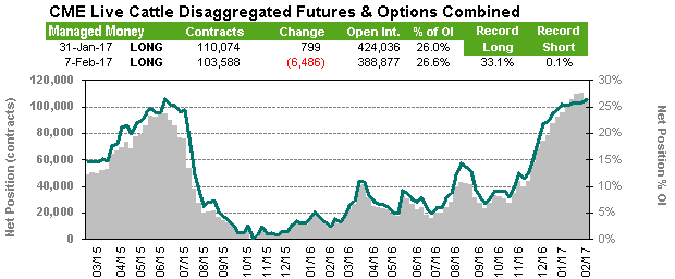 Au niveau des spéculateurs, entre le 31 janvier et le 7 février, un net de 6,486 CàT de bœuf ont été vendus pour porter leur position à 103,588 CàT, représentant 26% des CàT existants (open interest). Première semaine où les spéculateurs ont un net négatif pour l’année 2017. Il y a un risque que les spéculateurs liquident leur position dans les prochaines semaines.