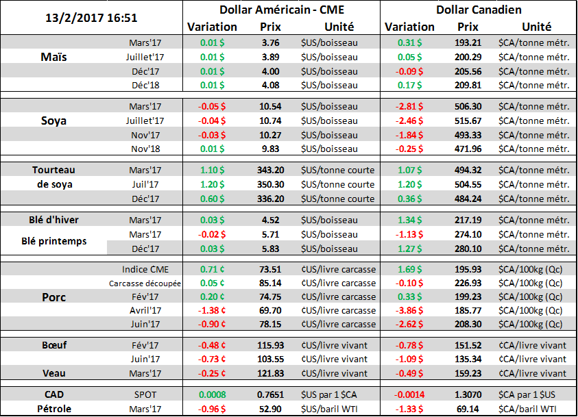 Coté grains, le marché semble confortable avec l’état actuel du bilan offre-demande. Les utilisateurs semblent laisser de côté la récolte record et mettent l’emphase sur la forte demande et les risques liés à la prochaine récolte (surface et rendement 2017). La volatilité a bondi la semaine dernière, mais elle demeure relativement faible comme c’est habituellement le cas en février.