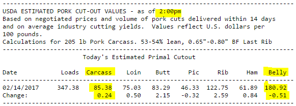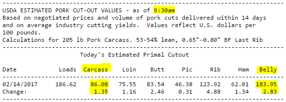 Hausse des prix hier après la publication matinale du prix des découpes, mais la fermeture s’est fait plus sur une note baissière alors que le prix a redescendu de 0.50¢/lb dans la dernière heure. Ceci est dû en autre au 2e rapport de la journée du prix des découpes. En effet, le rapport publié à 10:30 AM (heure de l’est) était très positif pour chaque découpe et on avait une augmentation de 1.35¢/lb sur l’ensemble de la carcasse découpée. Le prix du porc a donc fortement monté pour atteindre près de 2.00¢/lb de hausse, effaçant la perte de la journée précédente. Le deuxième rapport sur la découpe qui est publié à 3 :00 PM (heure de l’est) est venu contrebalancer le tout pour nous indiquer un prix de la carcasse découpée à 85.38¢/lb (+0.24) seulement. Par exemple, le prix du bacon à 9 :30 AM était à 183.95¢/lb (+2.83) versus 180.92¢/lb (-0.51) à 3 :00 PM. Quand même une différence de 3.34¢/lb d’un rapport à l’autre. Voici la différence entre les prix du matin et ceux de l’après-midi hier. (NB : les heures ici-bas sont selon l’heure centrale)