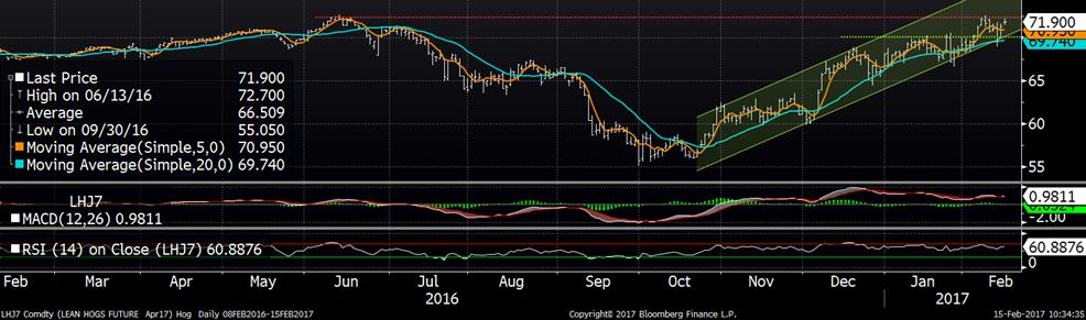 Voici donc la réaction du marché a réagi au courant de la journée. Gain en matinée et ensuite léger recul du prix alors que la carcasse découpée a été plus faible qu’anticipé. C’est donc une des raisons pourquoi on a vu le marché perdre une partie de son gain de la matinée en fin de journée. Le contrat d’avril a terminé la journée avec un gain de 1.60¢/lb et juin de 1.22¢/lb. L’indice CME est de 74.62 (+0.51) en date d’hier. Il y a aussi les cas nombreux cas de grippe aviaire en Asie qui donne un certain support au prix, mais il faudra voir si le Japon, la Chine et la Corée du Sud auront réellement augmenté leur achat de porc américain depuis le début de l’année, chose qui ne c’était pas concrétisée en 2016. La hausse des exportations nettes provenait essentiellement du Mexique.