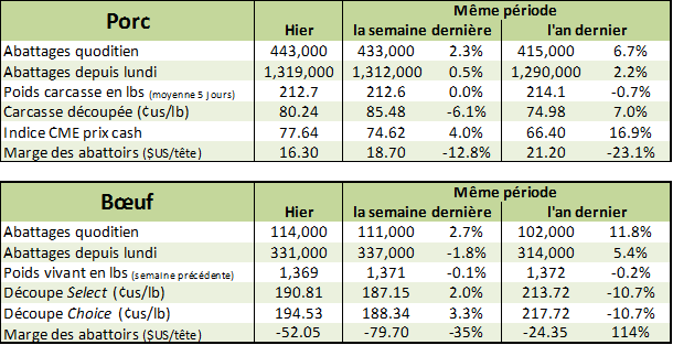 Journée assez intéressante hier sur les marchés bovins et porcins. Tout d’abord, les bonnes données venant du marché cash aux États-Unis a fait bondir le prix du contrat à terme de février de 2.20 ¢/lb. On se trouve dans la période de livraison des CàT, donc les limites quotidiennes seront à 5¢/lb pour lundi et mardi prochain (2 jours avant l’expiration), il serait possible d’apercevoir de grandes fluctuations d’ici l’expiration du contrat le 28 février. C’est pourquoi on focus davantage sur la variation du contrat d’avril afin de voir la réaction du marché à court terme en réponse aux résultats d’hier. En effet, les transactions se trouvaient 4-5¢/lb plus élevées que la semaine dernière à 123-124¢/lb dans les régions comme le Texas et le Nebraska (Voir les résultats ici). Ce qui a donc donné un élan au contrat de terme d’avril alors qu’à un certain point dans la journée on se trouvait à près de +2¢/lb, mais pour finalement terminer la journée à 116.075¢/lb avec + 0.77 sur la journée. Le prix des découpe était également un facteur positif sur la journée alors que le Choice affichait 194.53¢/lb (+2.72) et le Select 190.81¢/lb (+1.00). Le CàT du veau d’embouche ont également poussé dans la même direction alors qu’on avait +0.55 sur mars à 125.10¢/lb et +0.40 sur avril à 125.53¢/lb.
