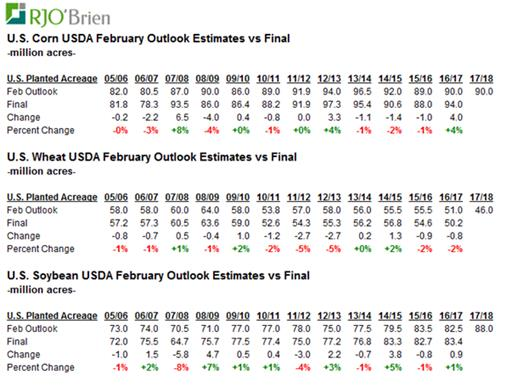 Ce matin, l’USDA a débuté sa conférence annuelle en dévoilant quelques idées préliminaires sur la récolte américaine 2017/18. Le brouillon complet du bilan offre/demande 2017/18 sera dévoilé demain matin. L’USDA commence avec des prévisions de 90 M acres de maïs, comme dans l’outlook de l’an dernier alors que les acréages finaux furent de 94 M acres. Dans le blé, on parle d’une diminution à 46.0 M acres versus 50.2 M acres l’été dernier ce qui est cohérent avec les intentions d’ensemencement de blé d’hiver. La « surprise » fût dans les projections d’acréage de fève soya à 88.0 M acres ce qui représenterait les plus importantes surfaces jamais semées sur les terres américaines.