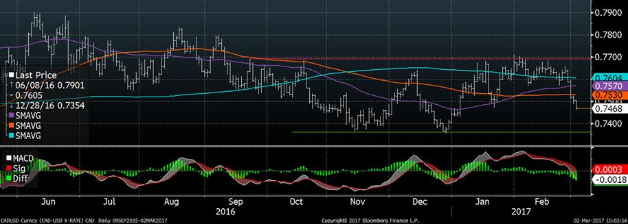 Le taux CAD/USD a nettement diminué depuis deux semaines, présentement à 0.747 $US par 1 $CA ce qui est le plus bas niveau de fermeture depuis le 4 janvier. Techniquement, il n’y a plus de support avant 0.738 ce qui laisse encore un potentiel de près d’une cent avant de rencontrer le prochain niveau surveillé par les traders. Il y a eu une cascade d’évènements depuis la semaine dernière causant cette dépréciation du dollar canadien. D’abord, la Réserve Fédérale Américaine (FED) a laissé sous-entendre qu’ils n’hésiteront pas à augmenter les taux d’intérêt pour contrer les stimuli économique de Trump. Présentement, la probabilité de voir une hausse de 0.25% du taux américain est de 4 sur 5 pour la rencontre dans 2 semaines. Inversement, Poloz, le gouverneur la Banque Centrale du Canada, a fait un discours avec un ton beaucoup moins agressif quant au taux directeur lequel est resté à 0.5%. De plus, le discours de Trump devant le congrès mardi soir s’est avéré rassurant aux yeux des investisseurs et a causé une demande pour le dollar américaine. Finalement, le prix du baril de pétrole recule de plus de 1 $US/baril aujourd’hui ce qui perdure la tendance de cette semaine.