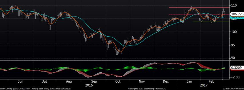 Le marché du bœuf a terminé la journée d’hier à la baisse pour une deuxième journée consécutive. Le CàT d’avril a glissé de 1.43 à 116.15 ¢/lb, juin de 1.08 à 106.73 ¢/lb et août de 1.05 à 101.95 ¢/lb. La faiblesse des prix provenait du marché global des matières premières et rien de particulier au marché bovin, l’Indice Bloomberg Commodity a diminué de 1.5%. Dans la région des plaines américaines, des prix cash à 125 ¢us/lb ont été rapporté ce qui démontre que les abattoirs continuent de miser fort en raison de leur marges qui sont redevenues positives à +9.6 $US/tête. Le Choice était à la hausse de 1.67 ¢/lb et le Select de 0.85, gardant la tendance des dernières semaines.
