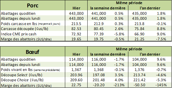 Le marché à terme de bœuf a terminé la journée d’hier à la baisse avec le contrat d’avril à 115.55 ¢/lb (0.43), établissant un nouveau bas depuis une semaine. Pour leur part, les contrats de juin a terminé la journée à 106.725 ¢/lb (-0.48) et août à 102.075 ¢/lb (-0.20). À court terme, le risque baissier semble limité étant donnée l’énorme écart entre le marché à terme et le prix cash lequel a été rapporté à 124 ¢/lb la semaine dernière dans les plaines américaines. Le prix des découpes a monté de 9 ¢/lb la semaine dernière ce qui a nettement aidé les abattoirs dont leur marge opérationnelle est redevenue positive après plusieurs semaines dans le rouge. Pour la journée d’hier, le Choice a gagné 1.53 ¢/lb à 209.60 et le Select a perdu 0.09 ¢/lb à 203.96. De la sorte, la marge des abattoirs est rendue à +22.75 $US/tête comparativement à +20.05$ vendredi et -20.20$ la semaine dernière.