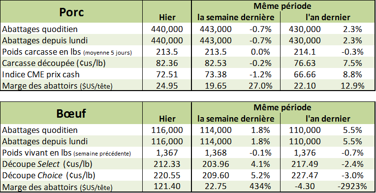 L’abattage à 116,000 têtes hier, en hausse par rapport à 114k la semaine passée et 111k en 2016. La valeur de la découpe en hausse à 220.00$ versus 209$ la semaine passée.