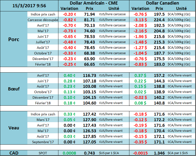 À moins que la grippe aviaire ne se propage aux USA dans la forme qui peut atteindre les humains, les cas de grippe en Alabama et Tennessee ne feraient que ralentir les exportations d’œufs et volaille et laisse donc un surplus de viande sur le marché domestique. Le résultat est une force négative pour le marché, du moins pour l’instant. Les traders sont toujours nerveux quant à l’abondance prévue pour le printemps face à une demande possiblement molle pour le bœuf. On s’attend à voir une augmentation de 520 millions de livres de viande pour Q2-2017 en nette hausse sur le trimestre précédent et l’an passé. Par contre, le cash est encore très positif à 124-126$ et nous allons surveiller l’encan électronique aujourd’hui pour voir de quelle manière les acheteurs réagissent – soutiendront ils les prix ou vont il baisser les bids?