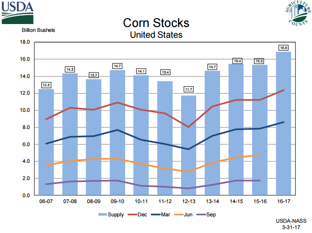 Soja : Stock au 1er mars évalué à 1.73 milliard en hausse de 13% par rapport à 2016 et 51 millions de plus que la moyenne des estimés. C’est une surprise bearish et implique un résiduel très élevé qui suggère que soit 1) la récolte 2016 est plus grosse ou que la qualité est meilleure. Peu importe, le rapport WASDE devrait corriger la situation et devrai réduire le « résiduel » de 15-20 million (fait augmenter les stocks de report).