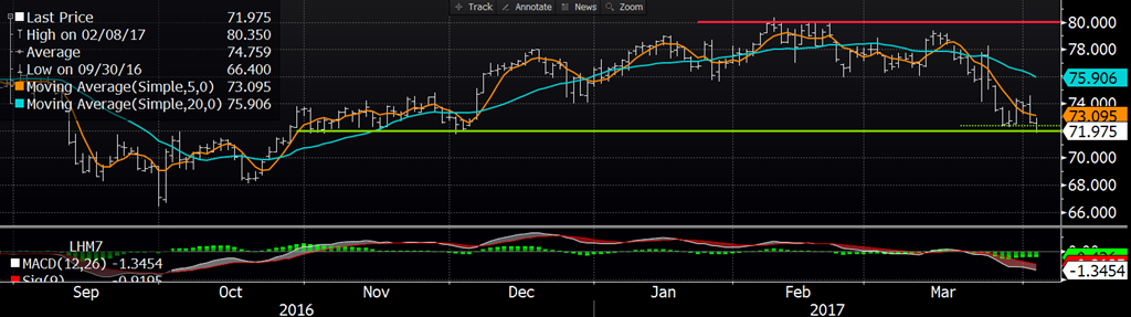Les prix du porc à la bourse ont atteint un nouveau creux hier sous la pression du prix cash qui recule. Le prix d’avril a fini la journée à la baisse de 1.125 ¢/lb à 63.675 ¢/lb pendant que les livraisons de juin ont perdu 0.68 ¢/lb à 71.975, tombant à son plus bas niveau depuis le 1er décembre. Le contrat de juin teste présentement son support technique à 72.00. Pour le contrat d’août à 72.55 ¢/lb, il est tombé à son plus bas niveau depuis le mois d’octobre lorsque le marché du porc était pris dans le panique de la capacité d’abattage aux États-Unis. Néanmoins, le prix des découpes se maintient au-dessus de 75 ¢/lb ce qui permet aux abattoirs de garder une marge historiquement élevée à 20-25 $US/tête.