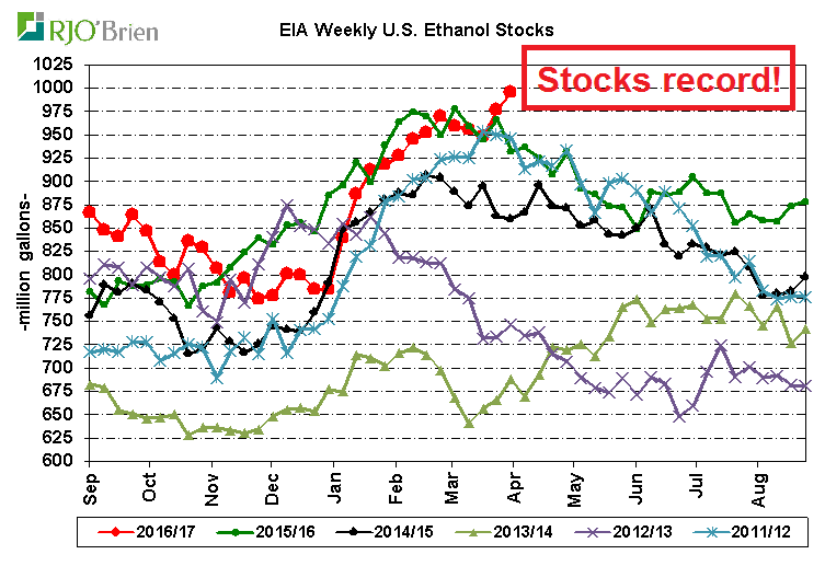 La production d’éthanol a baissé considérablement la semaine passée comme c’est habituellement le cas à cette période de l’année ou les usines de transformation en profitent pour faire de la maintenance printanière. Cependant, malgré le déclin notable, la production de la semaine dernière était encore 4,4% supérieure à l’an passé, essentiellement inchangé par rapport aux gains annuels des 7 dernières semaines, indiquant qu'il n'y avait pas de changement dans la production globale. Bref, malgré la baisse cette semaine, la production d’éthanol est très soutenue.