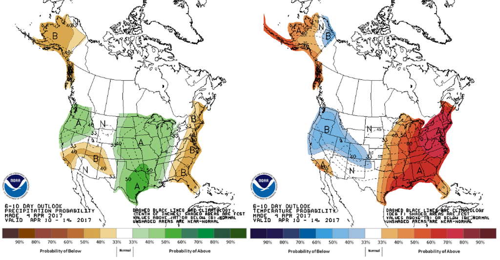 Coté météo, on annonce des pluies aux USA. Puise qu’on est encore tôt en saison les pluies sont plutôt bien vues pour améliorer la qualité des sols. Évidemment le printemps est une période clé pour le marché alors on surveille de près la situation pour déceler un retard de semis. Donc pour l’instant la pluie est bonne, la chaleur annoncée devrait faire sécher les champs rapidement et aider la germination des semis hâtif.