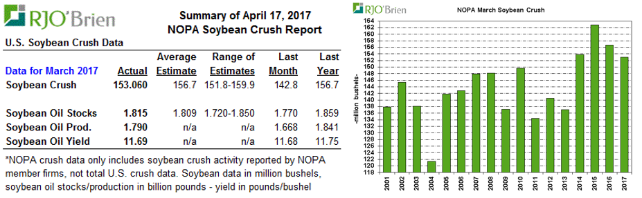 Les membres de la NOPA ont rapporté l’utilisation de 153 millions boisseaux de soya pour les activités de trituration en mars. C’est nettement moins qu’anticipé par les analystes qui s’attendaient à 156.7 millions, soit le même volume que l’an dernier. C’est le deuxième mois consécutif que le volume trituré est inférieur à 2016. Malgré la plus petite production de tourteau, le prix n’a pas résisté à la pression baissière du complexe des grains et a terminé la journée en baisse de 4.5 $US/tonne courte. Même avec les opérations de trituration plus faible, les inventaires d’huile sont de retour au-dessus de 1.8 milliard de livres indiquant un ralentissement de la demande.