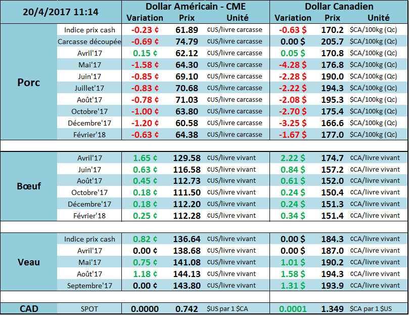 Le marché du porc a connu la même histoire hier que la vieille. Le prix des découpes était fort en matinée alors que la statistique d’après-midi était décevante ce qui a amené beaucoup de vendeur à l’ouverture des marchés. Malgré le faible du marché d’hier, le prix a fait un nouveau bas à l’ouverture et est presque 1¢/lb en dessous de la fermeture d’hier. Le prochain support est un peu au-dessus de 68 ¢/lb sur juin alors que nous sommes à 69¢/lb présentement. Les données du prix cash indiquait une stabilisation autour de 62.00 – 61.75 ¢/lb, mais la donnée de ce matin pour les ventes d’hier démontre que la baisse du cash n’est pas terminé ce qui propulse les CàTs à des nouveaux bas. L’indice CME sera à 61.59 (-0.31) demain matin. Fort possiblement que le marché attend de voir un revirement sur le marché cash avant de regagner confiance sur les livraisons d’été. Pendant ce temps, le prix des découpes est stable à 75.00 ¢/lb ce qui cause une augmentation de la marge des abattoirs qui est à 35 $US/tête.