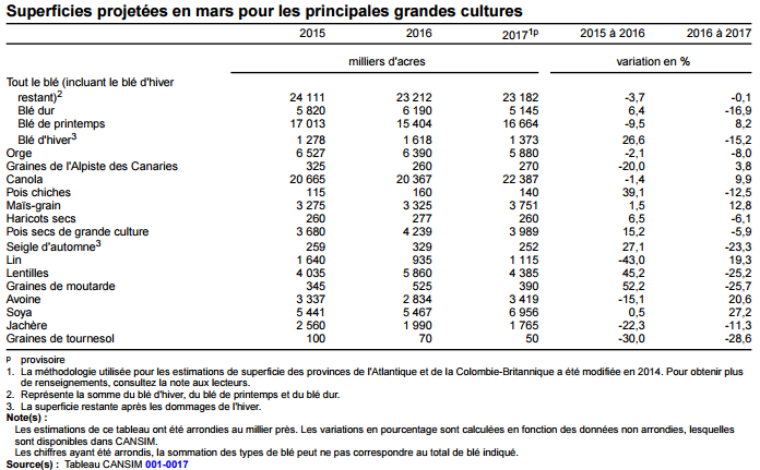 · Blé : les intentions d’ensemencement sont de 23.2 millions d’acres de blé pour l’été 2017 ce qui est sensiblement la même que l’an dernier. Cependant, on note une baisse du blé d’hiver et du blé dur, compensée par une augmentation du blé de printemps.